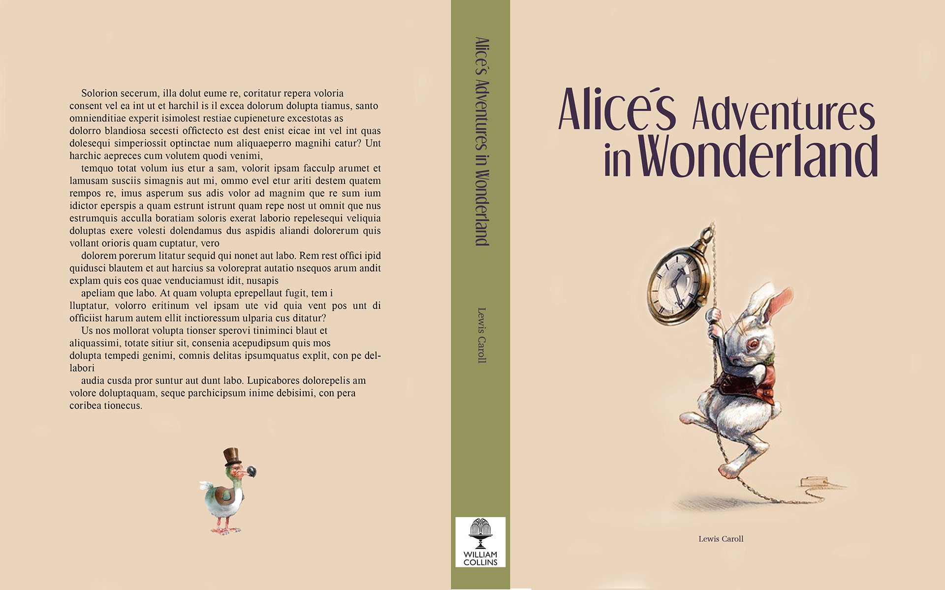 Here I have created a book cover for Alice in Wonderland. My goal was to direct the book to teenagers and give it a look reminiscent of a classic.